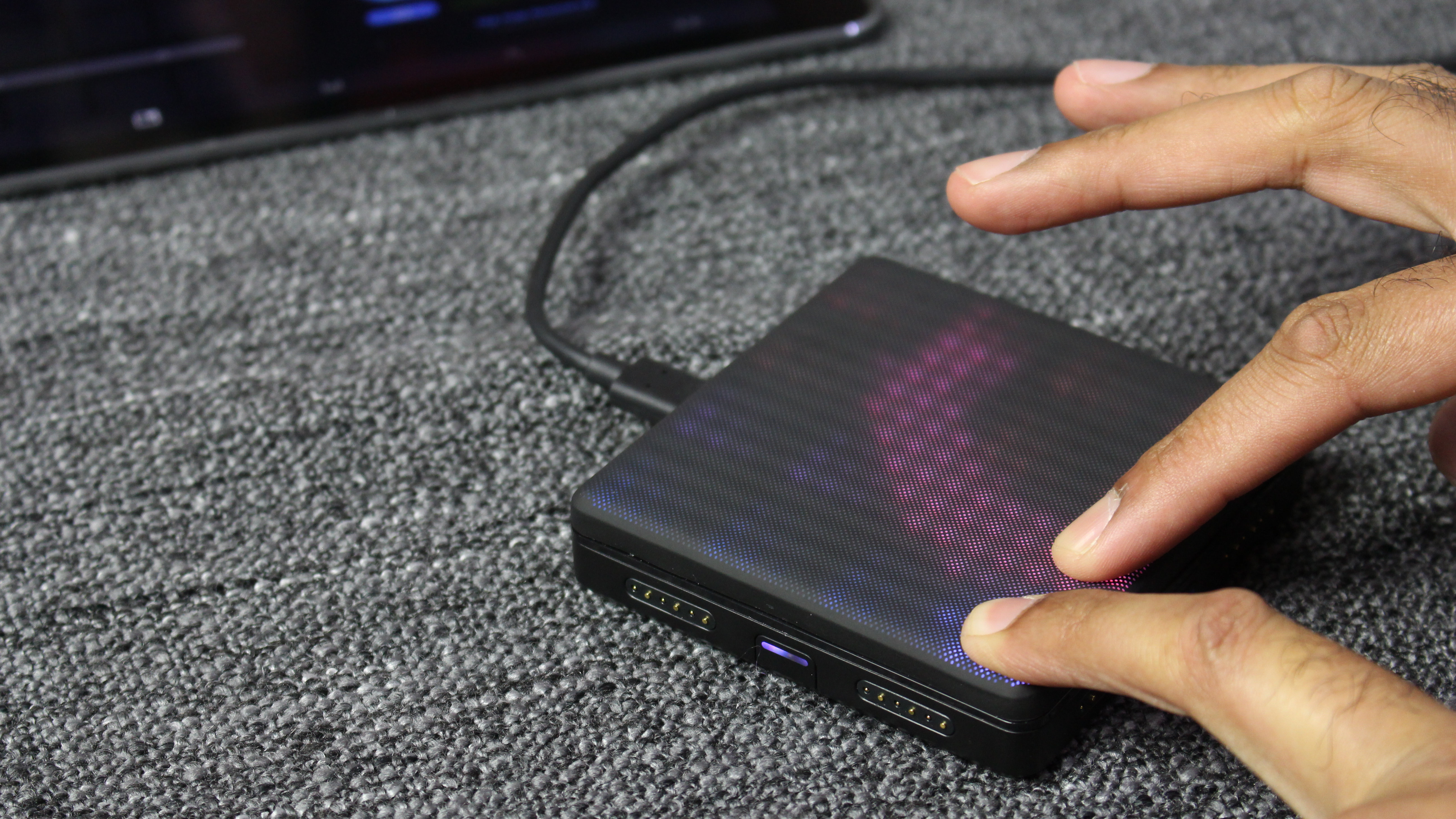 The Lightpad Block M is a MIDI pad controller with a very soft, flexible top. Underneath lies a bed of LEDs, which light up to denote different musical instruments or pads. There’s a USB-C connector to charge it up, and another button to turn the device on.